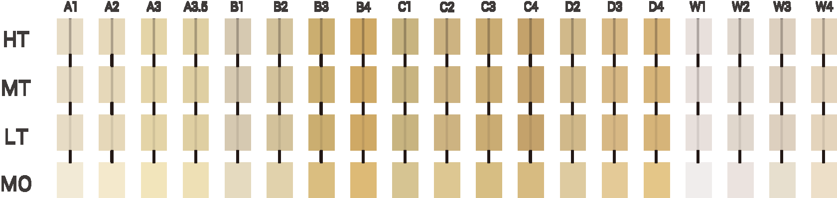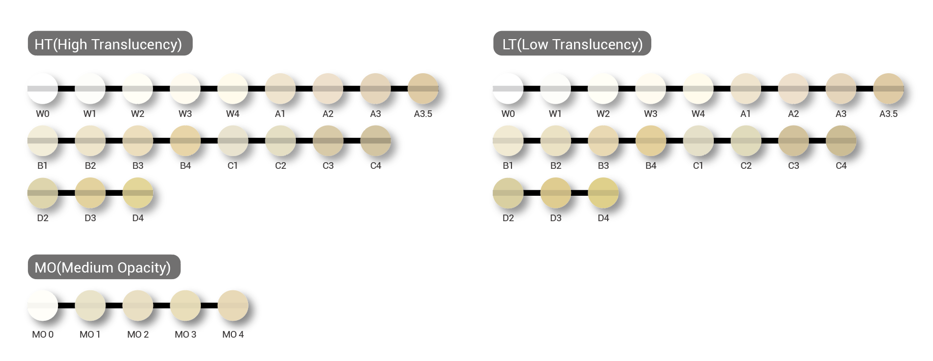 Оттенки:Блоки для прессования доступны во всех оттенках шкалы A-D и трех уровнях транслюцентности (MO, LT, HT).